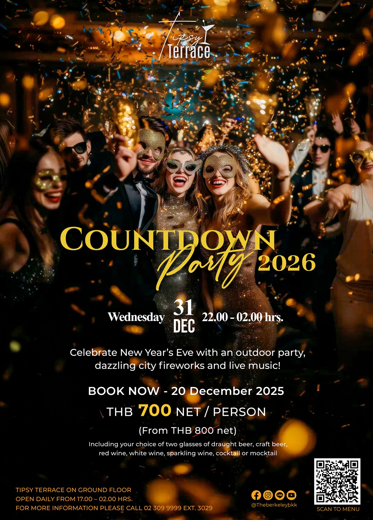 Celebrate New Year’s Eve with an outdoor party, dazzling city fireworks and live music at Tipsy Terrace (Ground Floor) in the heart of Bangkok!